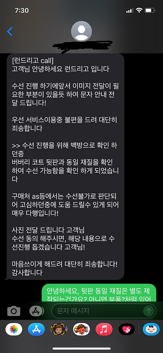1. 1차 통화 (9/25, 토) 상담사분이 옷이 손상돼서 죄송하다는 말과 A/S 진행 전에 고객 동의를 얻어야 해서 카톡을 한 것이라고 안내해주셨습니다. 어디가 얼마나 손상된건지 알고 싶다고 문자로 사진을 보내달라고 해서 사진을 받았습니다.