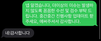 4차 통화 (9/30, 목)오후에 전화가 왔고 사설업체에 확인해 본 결과 수리가 가능 할 것 같다는 답변을 받았습니다.omg 진행 계획을 사진으로 보낼테니 진행여부 결정해달라고 하셔서 아래와 같이 문자 주고 받았습니다.
