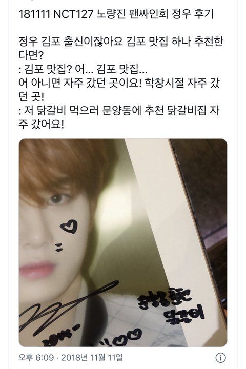 학교 밑에 닭갈비집 맛있거든.. 다들 한번씩 먹어줬으면 좋겠다...... 팬싸 후기에서 같은 닭갈비집인데 지역 다른데서 젱우가 먹었다고 언급한 적도 있어