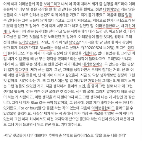 6월쯤에 사클에 Blue라는 곡 (가사가 좀 어두움) 올리고 나서 태용이가 브이라이브에서 해준 말이었는데 정말 한순간도 안 놓치고 너무 마음에 와 닿아서 메모해뒀는데 200일 기념으로 저 추천해준 플리 들으면서 이거 읽으니까 눈물남..