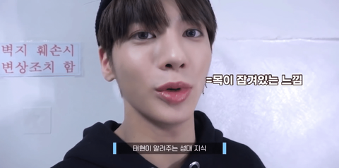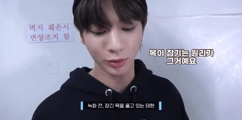 녹화전 잠긴목을 풀다가 팬들에게 목이 잠기는 원인을 설명해주는 태현