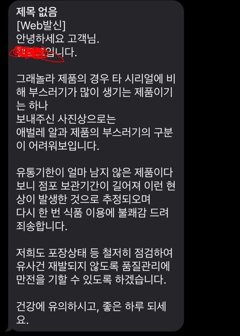 유통과정에서 일어난 문제인 것 같다는 답변 들었습니다.