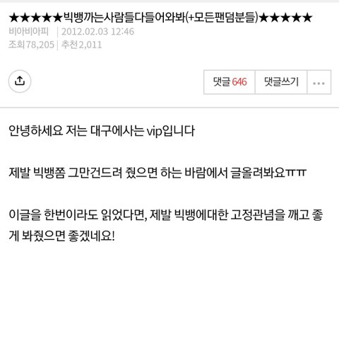한 글에서 위에 B팬덤과는 또다른 B팬덤이 욕을 먹자 이번엔 팬덤이 아닌 일반인 분이 '근데 VIP도 무개념소리 듣지 않았나? 근데 왜 걔네들이 뭐라고하지?'라고 하셔서 베플이 되었구요.