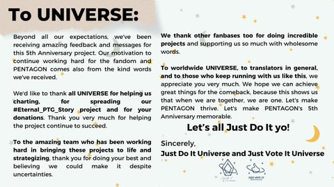 유니버스에게 : 이번 5주년 프로젝트에 대한 우리의 기대 이상의 놀라운 피드백과 메시지를 받고 있습니다. 팬덤과 펜타곤을 위해 열심히 일하고 싶은 동기도 저희가 받은 친절한 말에서 비롯되었습니다. 저희는 훌륭한 프로젝트를 하고 건전한 말로 우리를 많이 응원해 준 다른 팬분들에게도 감사드립니다. #Eternal_을(를) 널리 알리고 차트 작성에 도움을 주신 모든 UNiverse 여러분께 감사드립니다.PTG_Story 프로젝트와 여러분의 기부를 위한 것입니다. 프로젝트가 계속 성공할 수 있도록 도와주셔서 대단히 감사합니다. Worldwide Universe, 일반 번역가들, 그리고 저희와 함께 계속 이렇게 달려주시는 분들께 진심으로 감사드립니다. 우리는 컴백을 위해 좋은 것들을 이룰 수 있기를 바랍니다. 왜냐하면 이것은 우리가 함께 있을 때, 우리가 하나라는 것을 보여주기 때문입니다. 펜타곤이 번창하도록 해요. 펜타곤의 5주년 기념일을 추억으로 만들어요. 우리 모두 해봐요! 진심으로, Just Do It Universe와 Just Vote It Universe 이 프로젝트를 소생시키고 전략을 짜는 데 열심히 일해온 놀라운 팀에게, 불확실성에도 불구하고 우리가 해낼 수 있다고 믿고 최선을 다해 주셔서 감사합니다.