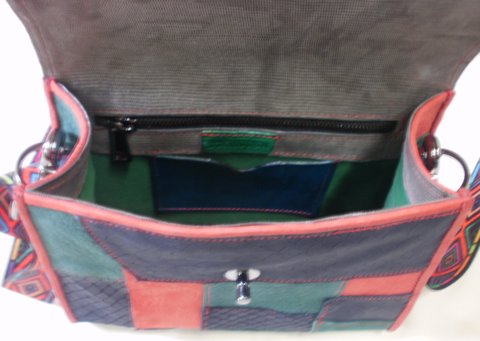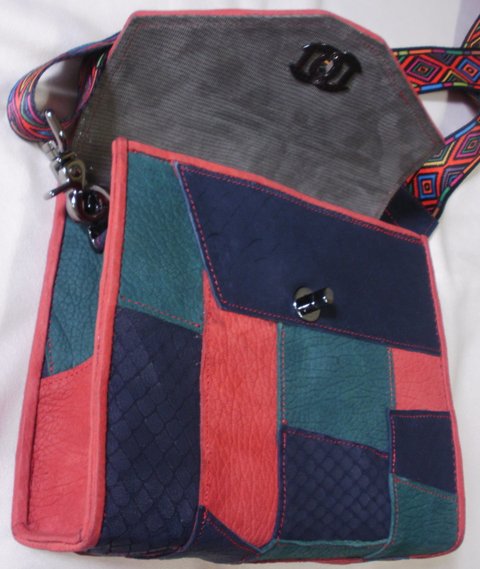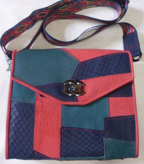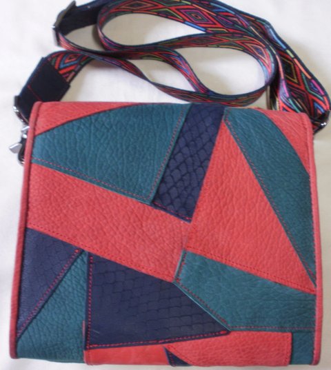 가죽(빨강,녹색,남색가죽 콜라보)을 한 조각씩 이어서 제작한 가죽과 화려한 무늬가 프린트된 웨빙을 사용하여 제작한 가죽 패치백입니다.(마디샤 가죽공예-대구가죽공예