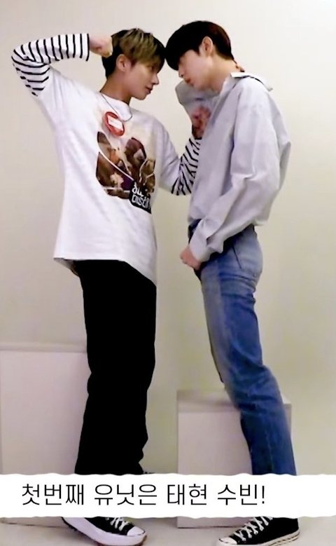 개높은 굽에 발꿈치까지 들어도 다리 벌린 최수빈보다 작은 강태현은..... 심각하게 귀여움..... 혼자 있으면 180이지만