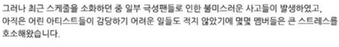 지수, 예서, 채연이 일부 극성 팬들로 인한 불미스러운 사고로 가수 활동에 대한 의지를 잃어