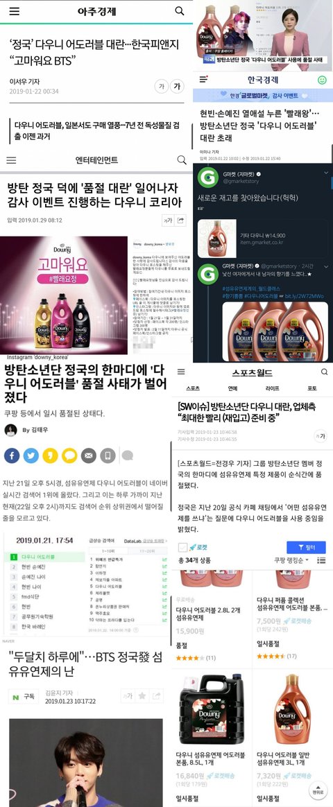 2년전 다우니때는 정국이가 아예 어도러블 뭐시기라고 상표이름까지 말했는데도 아무 문제 없었고 전세계에서 품절 품귀였는데 피엔지도 정국이한테 공식 감사인사 올리고 온갖 쇼핑몰에서 다 정국이로 홍보했자나 1년뒤에는 방탄 BT21 캐릭들이 다우니 모델도 됐고 정국이가 뭔 말만 해도 난리난리가 나니까 정병들이 질투나서 아주 발악하는구나