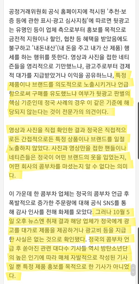 기자가 제대로 발로 뛰어서 쓴 기사고 핵심 내용은 전문가 의견으로 봐도 1.상표 노출 브랜드 언급 전혀 없고 2.해당 회사들 댓가도 없어서 뒷광고 자체가 성립안됨 3.공정위 민원은 사실 관계여부 확인없이 누구나 넣으면 일단 접수됨 4.품절기사도 제품 홍보 아닌 정국의 인기가 많아서 자발적 으로 나온 기사고 5.자꾸 이런 논란을 일으키는 기사들도 문제라는 얘기야 처리 기간은 2주일정도 걸린다는데 어차피 정황상 최종 기각될 민원임