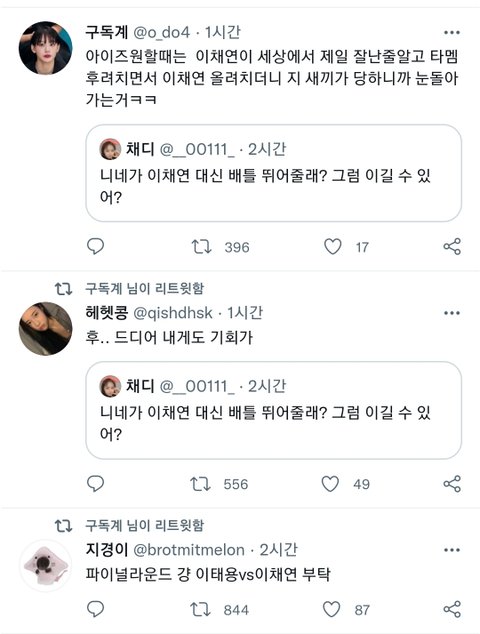 참고로 이채연팬덤이 아이즈원 타멤 후려친게아니고 후려치기 시작한건 트위터에서 김채원 사쿠라 인장이 이채연팬게 시작이였고 그뒤어 이채연팬덤도 빡쳐서 대응한건데 저걸로 지금까지 이랬던거...ㅋㅋ