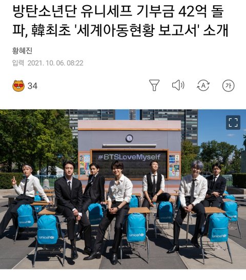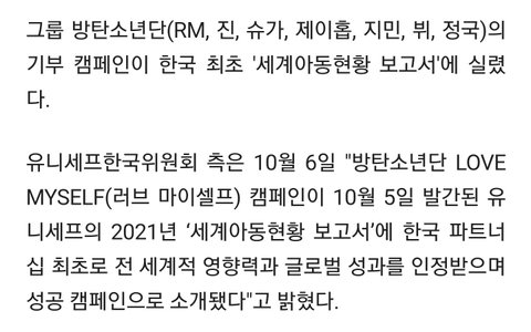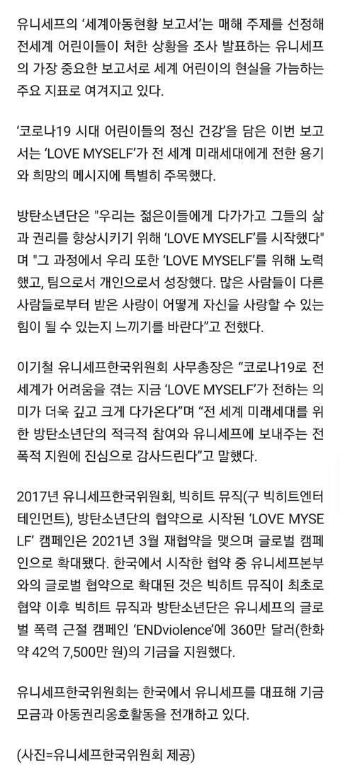 방탄소년단 유니세프 기부금 42억 돌파, 韓최초 '세계아동현황 보고서' 소개