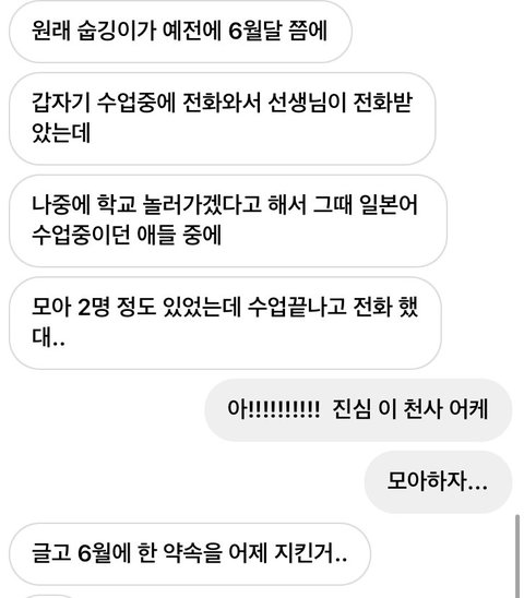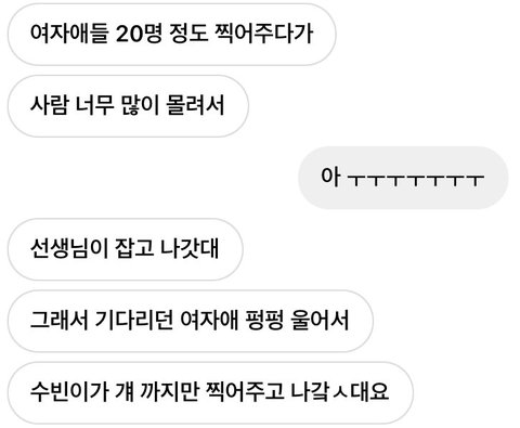 너어느은 진짜 모아들 천만명 울렸다 기다리던 애가 우니까 걔까지 찍어주고 나간것도 너는진짜하미친다 약속 지키러 간것도 너무 수빈이스럽고 수빈이랑 전화한 모아들도 부러움 정작 수빈이는 17에 자퇴했는데 아직도 쌤들이랑 너무 잘지내는거보면 애가 얼마나 좋은애인지 실감