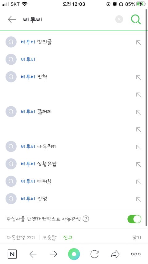 초록창에 “비”만 쳐도 비투비가 제일 위에 떠서 좋아. 근데 비투비 쳐보면 제일 위에 ㅂㅇㄱ이랑 아래쪽에 ㅅㅎㅁㄷ 뜨는데 나만 이거 조카 별로임? 멤버들 특히 서치 많이하는데 ㅂㅇㄱ, ㅂㅇㄱ19 이론거 뜨면 기분이 우짜겠어.. 비투비만 해당되는거 아니고 타 아이돌분들도 많이 해당되는데 난 이거 좀 그지같음. 이런거 왜쓰는거야..?