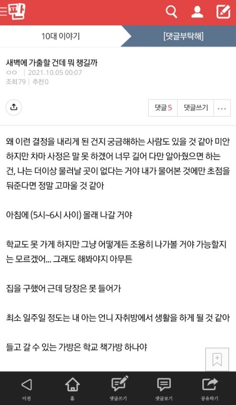얘들아 알아둬 만18세 이상은 가출인으로 나뉘어지고 가출인은 아무리 부모님이 가출 실종 신고를 해서 경찰들 찾아와도 강제귀가 조치 못 시켜 그리고 주소도 알려주지 말라고 하면 안 해줌 내가 인터넷으로 법 찾아보니까 그렇긴 하던데 확실하지는 않네 궁금해하는 사람 많으면 후기 남길게 ㅎㅎ...