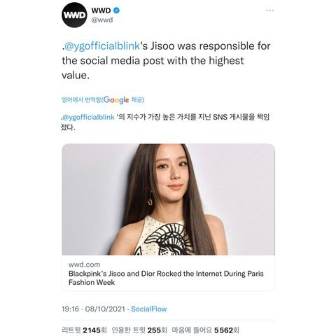 블랙핑크는 파리 패션위크의 돌풍을 일으켰고, 한국 걸그룹의 멤버, 지수는 가장 높은 가치를 가진 게시물을 책임 졌습니다
