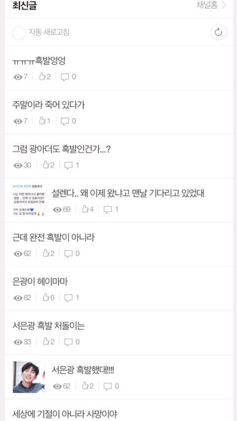 나른한 일요일 오후에 아무 생각 없이 뒹굴뒹굴하고 있다가 갑자기 들려온 흑발 서은광 흑발 광아더 흑발 광냥이 흑발 서이사님 흑발 서햇살 소식에 심장이 뛰기 시작해서 (물론 심장은 늘 뛰고 있었고 어제까지 봤던 탈색모 서은광도 굉장히 예쁘다고 앓는 중이었지만 아무튼) 한 페이지 가득 앓고 있는 매우 투명하고 행복한 팬톡 멜로디들의 흔적을 담은 짤^_^