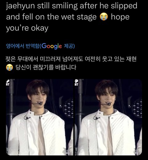 미국에서 진짜 미끄러워서 크게 점프하다 넘어지고 뒤로넘어가는 체리밤하다가 마이크에 척추 찍고도 무대 끝까지 마친후 영어로 인사까지 하고 멀쩡한척 걸어나간후 백스테이지에서는 경호원들 양측에서 부축받으며 다리 완전히 절면서 나가던 태용 생각나네 그때도 속상해서 진짜 화나던데 심지어 며칠후 또 공연함 그 넘어지는거 짤쪄서 톡선에서 조롱글 쓰고 염병하던 싸이코 정병이는 꼭 천벌받을거임