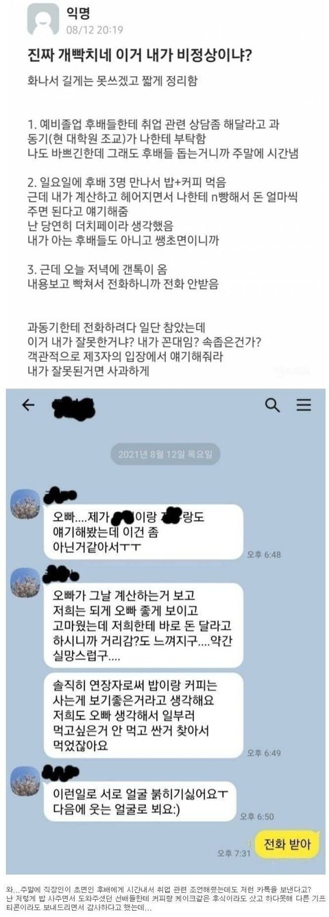 걍 주작임. 보통 회사원이면 대학 후배한테 n빵 하자곤 못함. 그냥 주작임. 그리고 전부 여자만 있는것도 아닐텐데 굳이 그 중에 여자가 저런 톡을 보냈다고? 같이 있던 남자후배는 그럼 빙신인가? ㅋㅋㅋ