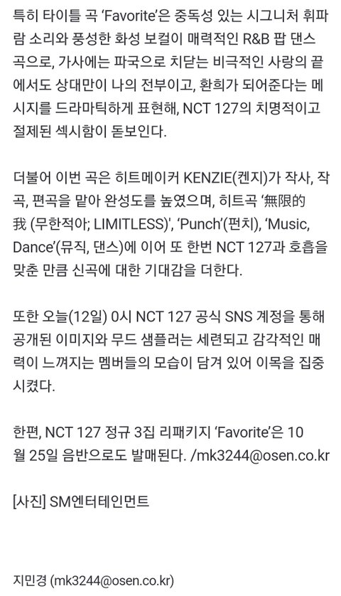 NCT 127, 신곡 ‘Favorite’로 강렬 변신..드라마틱한 러브스토리 예고