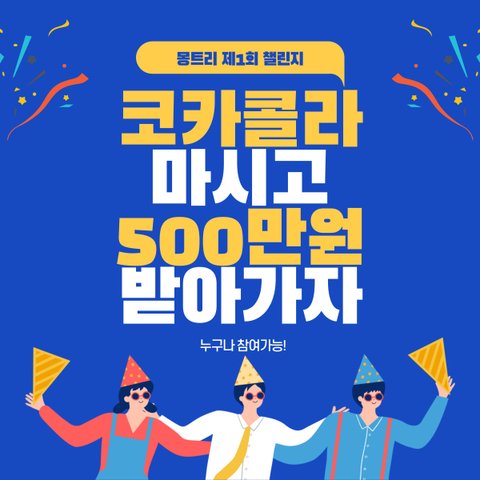 챌린지 제목: 코카콜라 마시고 500만원 받자.응모기간: 2021.10.11 ~ 11.20응모자격: 코카콜라 영상 찍고, 500만원 받아가고 싶은 지구인 누구나!제작형식: 해상도 HD(1920x1080)이상 / 권장 파일형식: MP4 or MOV / 파일용량: 1GB 미만참여방법: 코카콜라 오리지널을 이용해서 자유롭게 영상 촬영 후 아래 신청접수에서 신청시상내역: 1등 상금 500만원 참가자중 작품이 선정되어 몽트리 채널에 게제된 분들께 5만원 지급제작형식: 패러디, 유머, ASMR, MV, 브이로그, 인포그래픽, 1인방송 등 무엇이든 자유롭게 표현유의사항:모든 응모작은 미발표된 순수 창작물이여야 하며, 저작권은 응모자에게 있으며, 몽트리의 홍보사업 및 각종 홍보등에 활용됩니다.