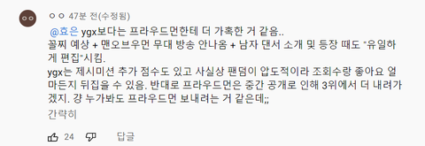 심지어 어제 방송도 못탐. 남자 댄서 등장떄도 훅과 함께 유일하게 편집시킴.. 제시 미션도 제시랑 싸우는 듯한 악편예고만 하고 걍 분량이 적게 나옴. 원래 저지점수 최하위에 조회수도 그냥 그랬으면 당연하게 탈락일텐데 생각보다 조회수 높게 나와서 프라우드먼을 더 지우려고 편집에서 발악하는듯...