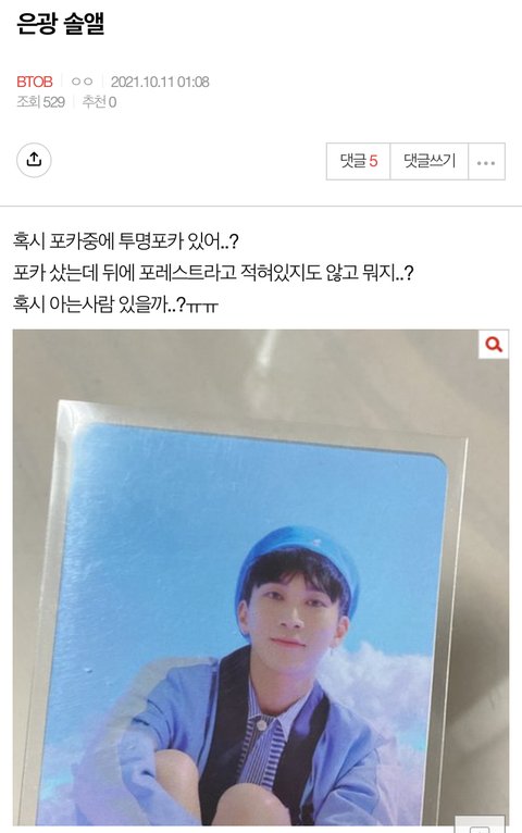 판매자분이랑 연락 닿았는데 솔로앨범 예판 특전이라는데 처음 말씀 하실때에는 영통 특전 포카라고 하셨거든.. 예판 특전 포카도 아무리 찾아도 없고ㅜㅠ 저 포카 사진도 공식사진이던데 비공굿 맞는거지?? 뭐라고 판매자분께 말씀드려야할까?..ㅠㅠ 진짜 자꾸 물어봐서 너무 미안해..ㅠㅅㅠ