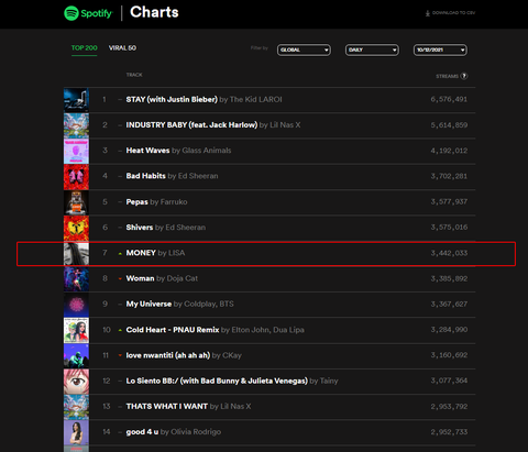 리사 머니 스포티파이 글로벌 순위 7위 (일일 Streams 344만)