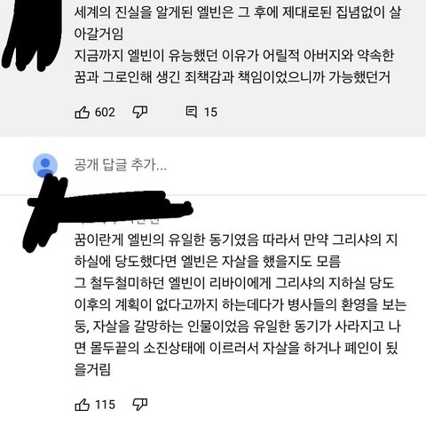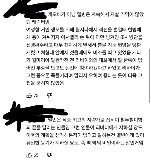 아르민이랑 엘빈 둘 중 하나 살려야 하는 장면 영상 댓글인데 솔직히 나도 리바이가 왜 아르민을 살렸을까 이해가 완벽히 되진 읺았거든? 근데 이 댓 보고 ㄹㅇ머리 띵해짐. 엘빈을 쉬게 해주고 싶다는 말도 어느정도 맞다고 생각했는데 저 말도 맞을듯. 어느 장면인지 기억을 안나는데 거인에 대해 얘기하다가 엘빈이 미소짓는거 보고 리바이가 ‘너 지금 웃은거야? 이런 상황에..?’ 이런 대사 한것만 봐도 적이 거인이 아니란 걸 안 엘빈은 진짜 의지를 상실했을 수도.....