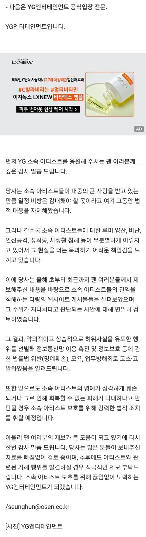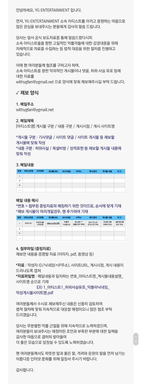 YG 대규모 고소공지 뜸