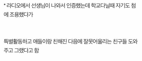 (본인이 처음에 조용했던 이유=5살에 유학가서 9~10살 무렵 돌아와서 적응하느라 그뒤로 자기같은 친구 다 어울릴수 있게 도와주고 다녀서 초중고동창 전부 미담뿐임)