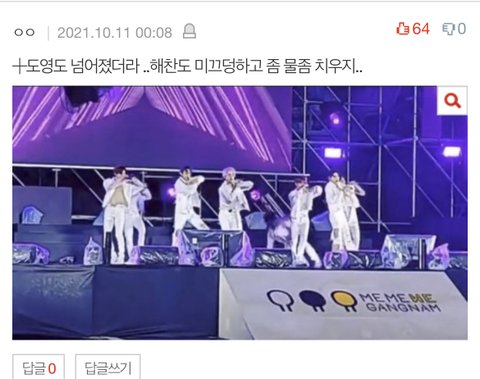 빗물 너무 심해서 그날 가수 여럿 넘어졌고 1초 허리 잡은걸로 티냈다고 팸