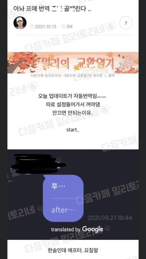 2. 유ㄴ버스 자동 번역..ㅋㅋㅋㅋ쓰뤡이임ㅋㅋㅋㅋㅋㅋ(타돌분 이름만 가렸엉)