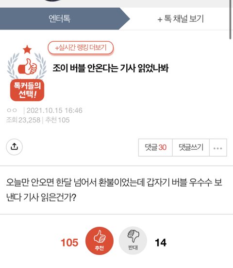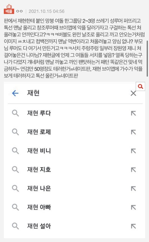 스엠 버블 첫번째글은 몰라도 두번째글은 자주 오는 아이돌들 까지 넣어서 악개잔치하고 날조해서 이미지 땅땅 낙인하고 개불쌍함.. 참고로 난 남돌팬임 남돌도 까지마 거기서 날조 당한 엔시티 재현 해찬 태용 엑소 디오 레드벨벳 에스파(얘넨 특히 잘오지만 찬반 날조)등등도 그만 까 제발..