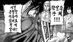 한지의 주장에 대다수의 사람들이 찬성하지 않을거라는건 쉽게 짐작 할 수 있고 그 증거가 예거파의 탄생과 예거파 지지로 인한 쿠데타가 아니였나 하는 생각이 듦. 이건 뭐 뻔한 말이라 할 수 있는데 내 말은 한지밑에 있던 104기 애들도 나름 땅울림이 일리가 있다 생각을 하던 애들이 있고 그래서 에렌을 그렇게 쉽게 용서하고 고맙다라는 말까지 할 수 있던게 아닐까 싶었던거임