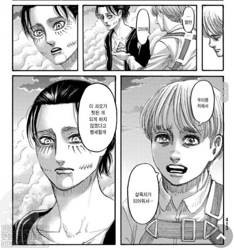 특히 한지가 학살은 절대 안돼! 라고 하는 장면과 한지가 빠진 조사병단을 이끄는 아르민의 살육자가 되어줘서 고맙다는 대조되는 발언이 되게 인상깊었는데.... 그 당시 아르민은 이런 뜻이 아닌 에렌의 숨겨진 의도와 심리를 듣고 한 말이지만 한지라면 절대 용납하지 않았을 에렌의 발언들을 수긍하고 고맙다라고까지 말을 하는데 정말 땅울림을 지지하는 (한지에 반대하는) 의견이 1도 없었어도 할 수 있는 말이었을까? 물론 땅울림으로 지금의 파라디인들도 썩 당당할 수 있는 입장은 아니게됐지 하지만 전에는 안 그랬나? 어차피 다들 악마라고 몰살시키려했잖아. 그리고 한지 뜻대로 했으면 성공 했을거라고 조사병단중 누가 장담 할수 있었을까?