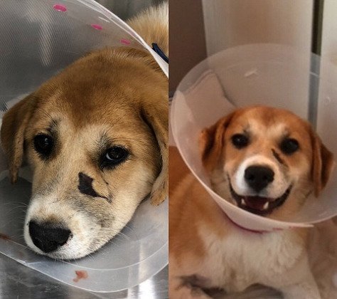 구조 후 병원에서 보여준 럭키의 표정과 수술 및 치료 후 임보자님 집에서 럭키의 표정입니다. 우리는 길에서 외롭게 죽어가던 생명에게 살 수 있다는 희망을 주었습니다.