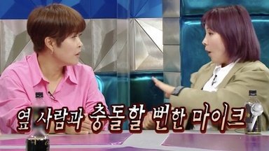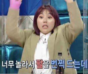 핸드 마이크를 들고 너무 놀라서 팔을 번쩍 들었는데