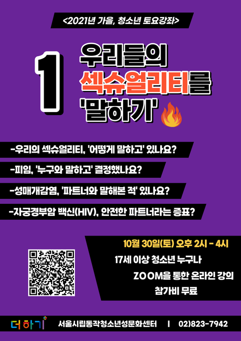 드라마, 만화, 영화, 소설, 유튜브... 성적관계와 행위를 그려낸 내용의 콘텐츠들이 넘쳐나는데, 정작 ‘청소년들의 성’은 말하지도 보지도 들을 수도 없도록 금기시됩니다. 청소년들을 성적 주체로 인정하지 않는 사회적 문화, 불편하지 않나요? 동작청소년성문화센터가 운영하는 토요강좌의 첫번째 시간은 ‘청소년들의 섹슈얼리티’에 대해 말하려고 합니다. 나의 섹슈얼리티, 어떻게 누구와 말하고 있나요? 어떤 방식으로 성적실천에 합의하나요? ‘섹슈얼리티’는 우리에게 어떤 의미인가요? 안전한 성적실천을 위해 알아야하는 것들은 무엇일까요? 섹슈얼리티에 대해서 말하고 싶은 모든 청소년들, 10월 30일 토요강좌에서 만나요!일시: 2021년 10월 30일 오후 2시 - 4시대상: 17세 이상 청소년 누구나운영: ZOOM을 통한 온라인 프로그램 운영비용: 무료신청: