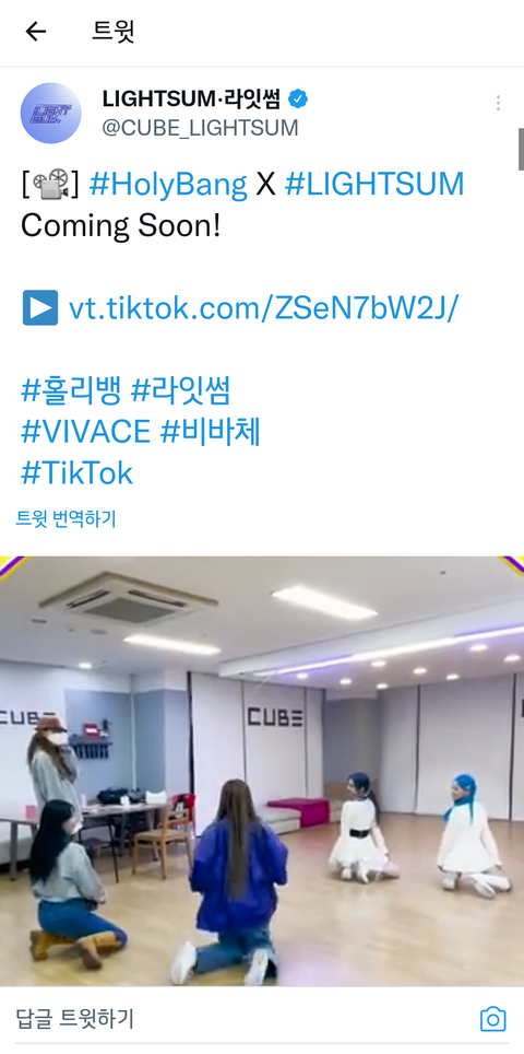 오늘 틱톡에 홀리뱅하고 라잇썸 콜라보한다는 소식이 떴습니다.