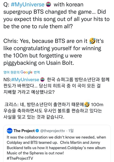 + 이번 콜라보곡 my universe가 히트곡이 될 줄 알았냐는 인터뷰 질문에 BTS가 참여한 이상