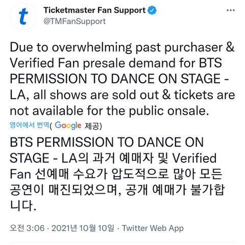 원래 이런 스타디움 콘서트는 미국 탑스타들도 6개월 전에 미리 공지하고 예매띄우는데, 방탄은 코로나 때문에 급하게 예매 약 일주일 정도 전에 공지 띄우고도 매진됨. 그리고 미국은 콘서트에 초상권도 포함되어서 한국의 4~5배는 기본으로 비쌈