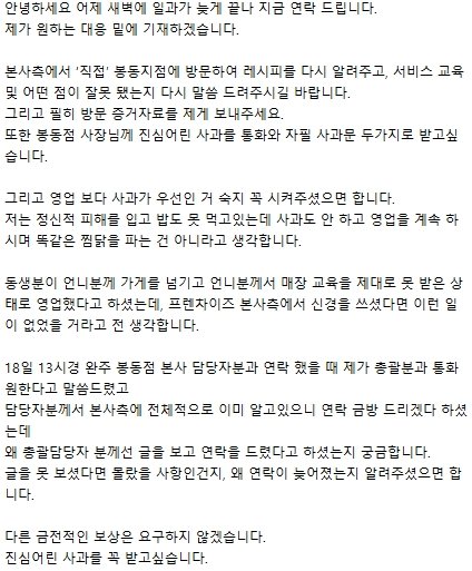 담당자분께선 이런 일이 생겨 정말 죄송하고 이번일을 계기로 가맹점들을 더욱더 신경쓰겠다고 하고 다시는 같은 일이 반복되지 않게 하겠다고 사과하시며 마무리 됐습니다.