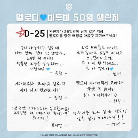 이 예쁜 말들이랑 같이 미복귀전역 기사 내보낼 수 있도록 계획하고 있었던거야? 완전체기념 50일챌린지 만들어준 것부터 감동인데 D-25의 빨간 별표가 이렇게 특별한 날을 예고한 거였을 줄이야 고맙당ㅜㅜ