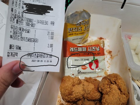 뼈는 간장 순살은 뿌라이드(학치즈&레드페퍼)를 주문해서 먹었습니다. 그런데 먹던중 시즈닝에 적혀있는유통기한이 년도가 다르길래 자세히 보았더니 레드패퍼 시즈닝이 유통기한이 지난 상태였습니다. 치킨은 이미 절반가까이 먹은 상태였구요.