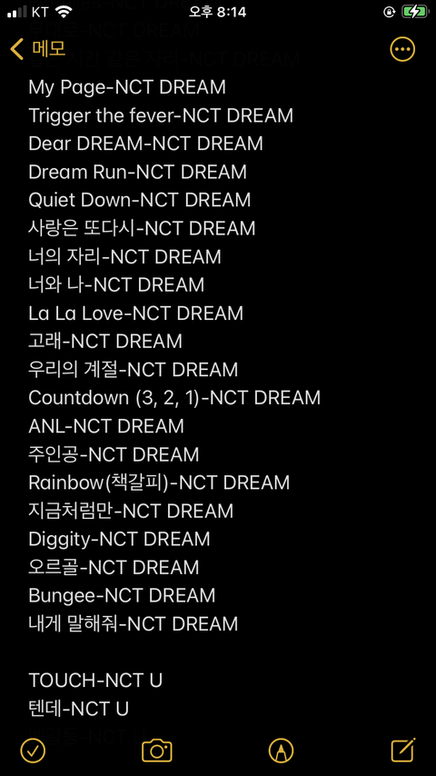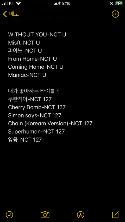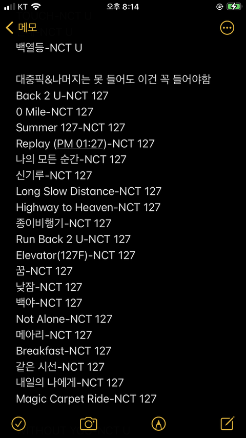 이번에 입덕한 친구한테 보내주려고 적어놨던건데 너네도 같이 보면 추팔도 하고 좋을 거 같아서 올려! ㅎㅎ 곡 수가 너무 많아서 오타 심해ㅠㅠ