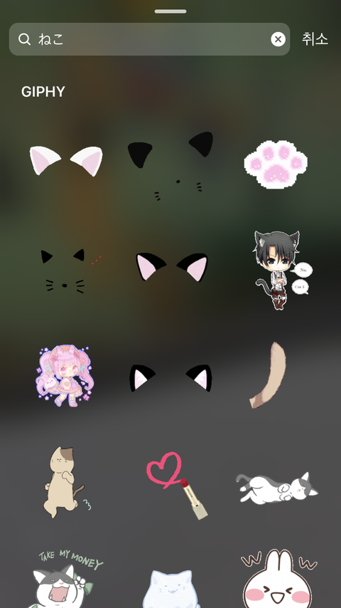 저기 리바이 스티커..히라가나로 네코라고 검색하면 나온당ㅋㅋㅋㅋㅋㅋㅋ근데 스토리 올릴 때 절대 못 쓸 듯….