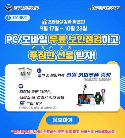 - 이벤트 내용: 이벤트 응모 및 보안점검 완료 시 -전원 커피쿠폰 지급 & 추가경품추첨