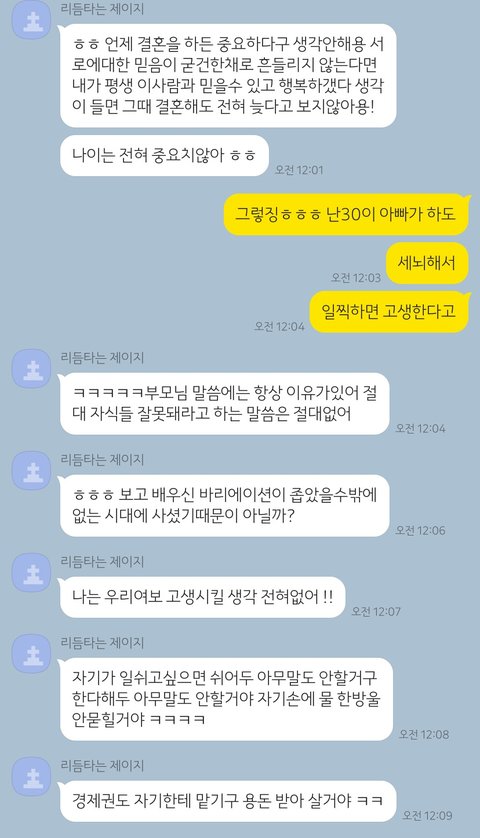 사회는 제 친구가 봐준다, 결혼하면 직장 그만뒀으면 좋겠다, 저를 고생시킬 생각 전혀없다며 쉬어두 아무말도 안할거고 한다해도 아무말도 안할거라고 손에 물 한방울 안묻힌다고