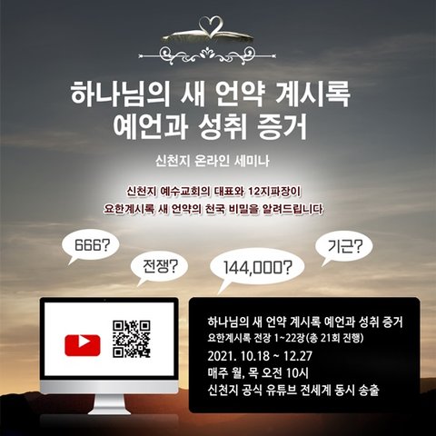 신천지 온라인 세미나 ‘하나님의 새 언약 계시록 예언과 성취 증거-계시록의 모든 비밀이 밝혀지는 시간’은 지난 18일 시작해 오는 12월 27일까지 매주 월요일과 목요일 신천지 공식 유튜브 채널을 통해 전 세계에 동시 송출된다. 21일은 지난 18일 이만희 총회장에 이어 이기원 요한지파장이 요한계시록 2‧3장에 대한 예언과 오늘날 그 성취에 대해 강의를 진행한다.