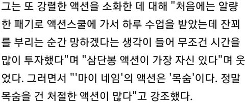 액션씬 대부분 대역 없이 직접 촬영했다고 함